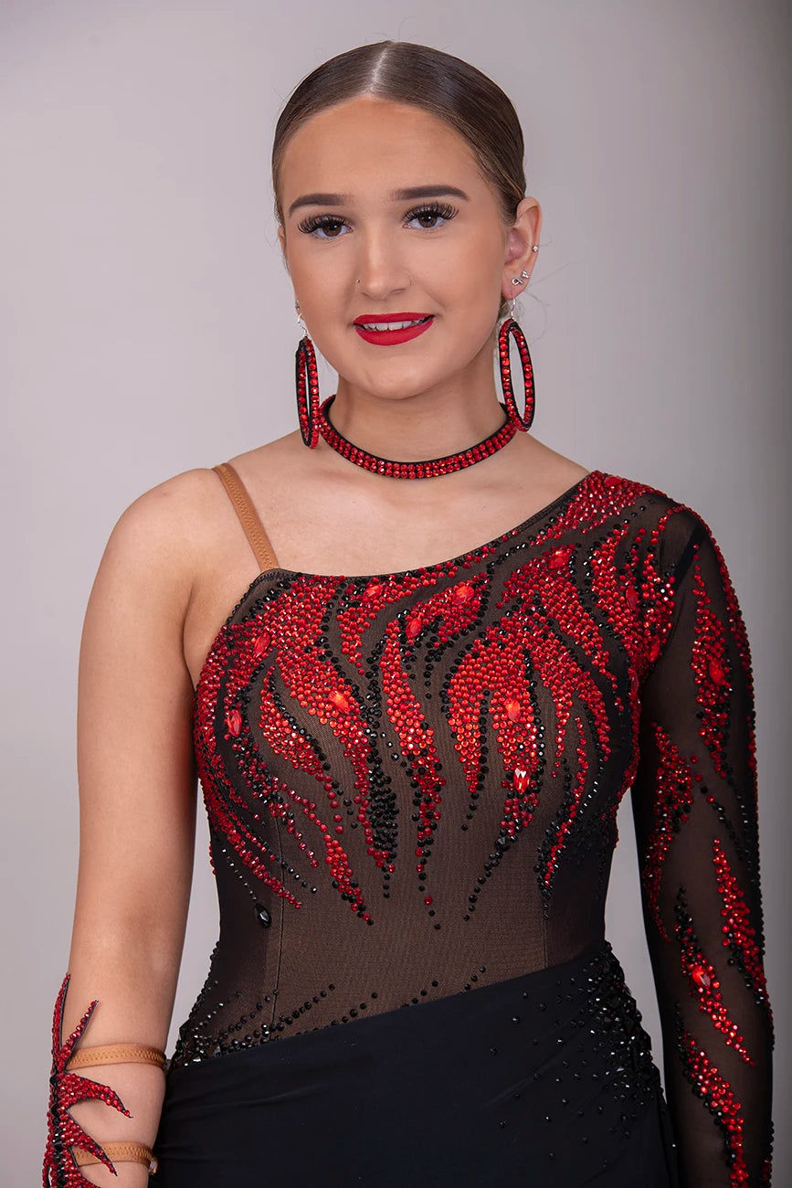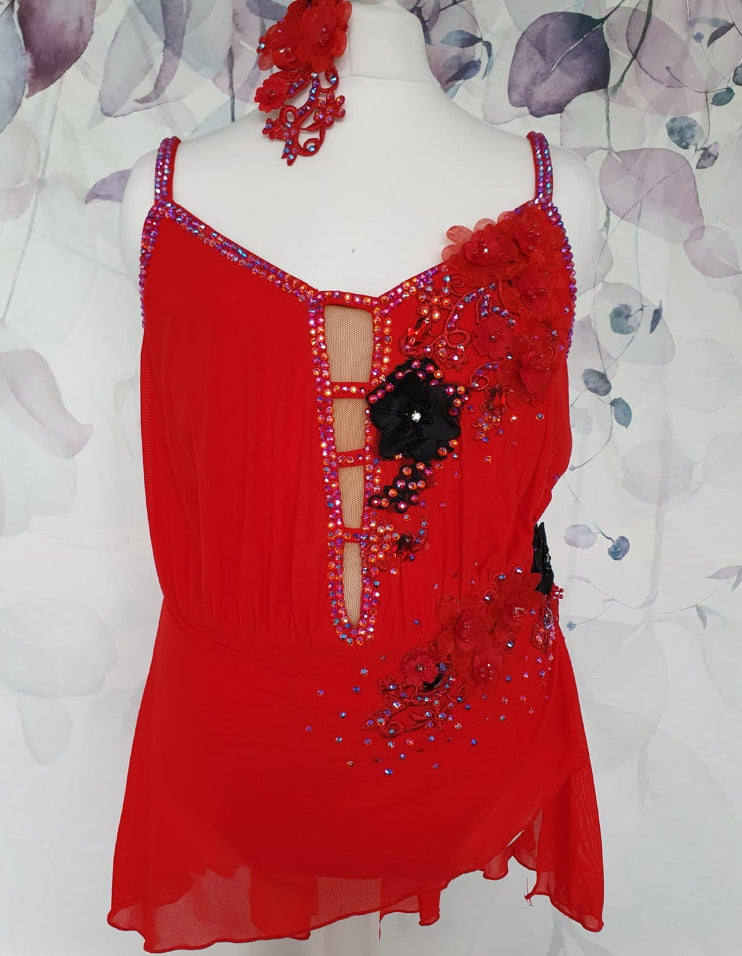 64L TWD ELITE Stand Out Competition Latin Dance Dress. Multiple layers of black & red fringe giving maximum movement. Fringe to upper chest motif stoned in AB, Jet & Siam. ❤️Showroom Appointments Available❤️