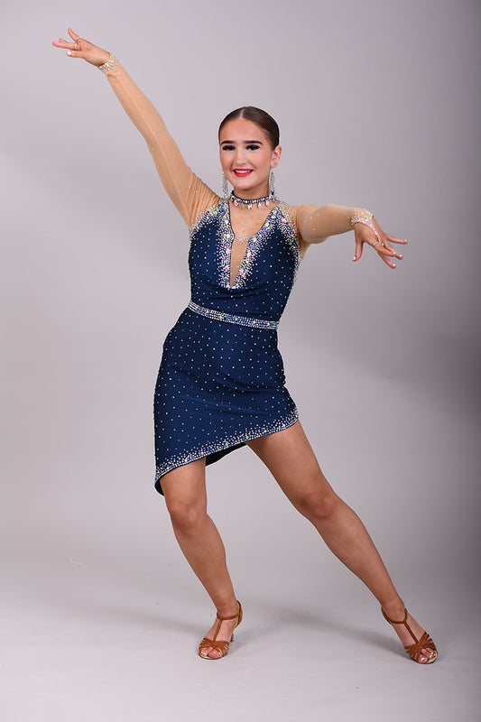 047 Navy blue Drape detail to the front Latin Dress. Separate belt. High mesh back. Decorated with Bermuda blue, light Saphire & Ab stones