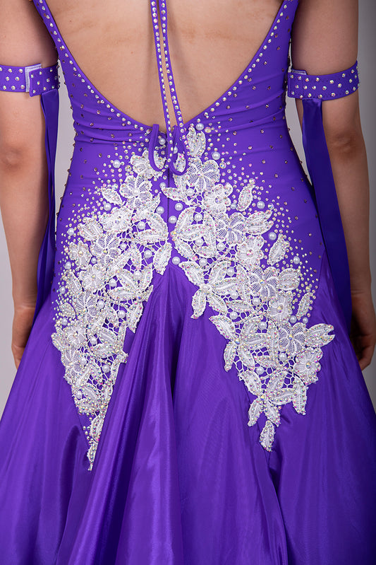 056 Purple Halter Neck Ballroom Dress. White lace detail front/back bodice. Purple fishnet panel on front. Decorated in purple & AB stones. Underskirts in White with exposed satin skirts to one side