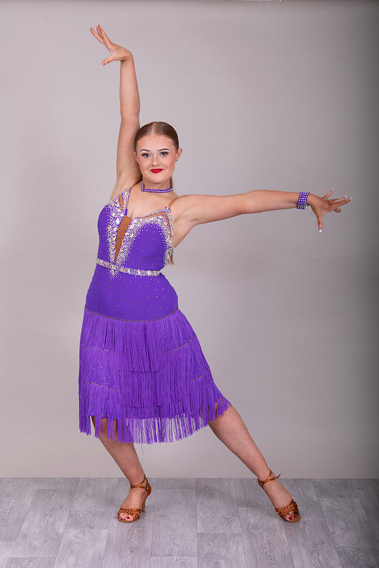 024 Cadbury Purple Fringed skirt Latin Dress. Detachable belt. Stoned in AB stones with tan panel to the chest.