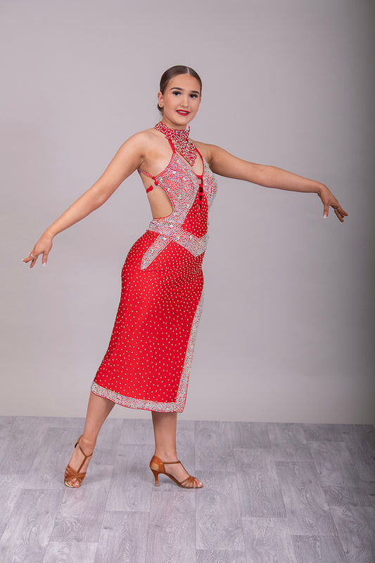 03B Red Ballroom/Sequence Competition Dance Dress. Heavily stoned in AB with Light Siam. Comes with detachable floats.