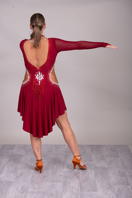 052 Wine Colour Latin Competition Dance Dress with heavily stoned stunning design in AB & Dark Siam High Mesh Back to give option of wearing own Bra. Flesh colour Lycra side panels (not see through) giving the illusion of cut outs.