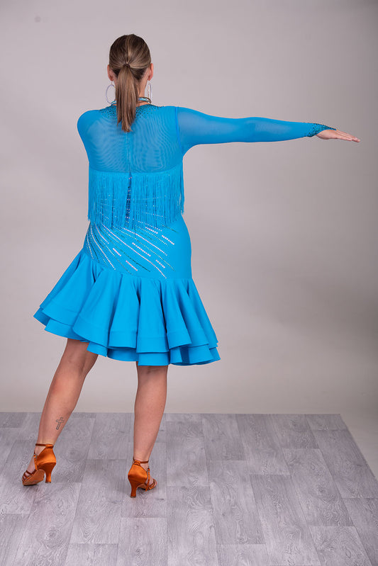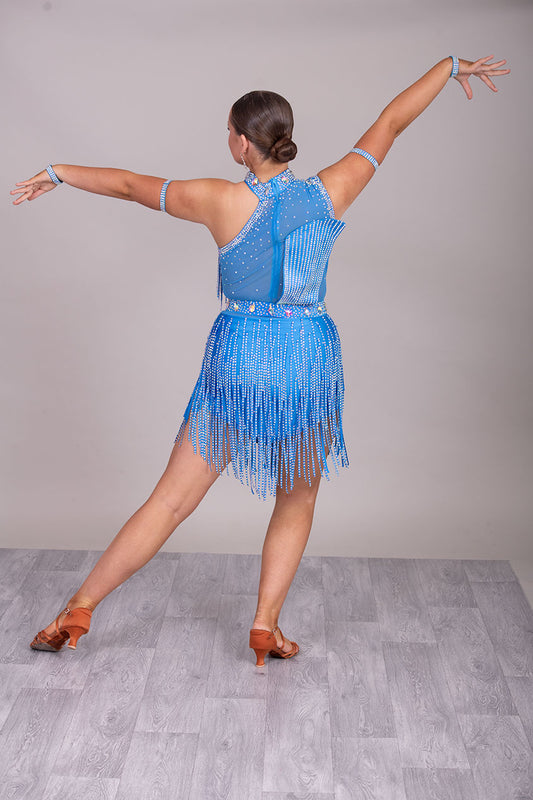 126L Gorgeous Blue Latin Competition Dance Dress. High Back allowing option to wear own Bra Very flattering design to the tummy/hip with full deep frill skirts for maximum movement & fringes to the upper chest