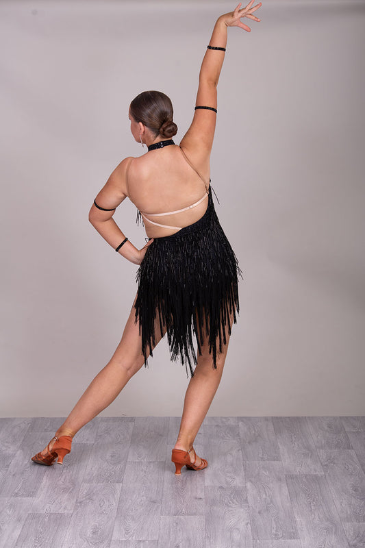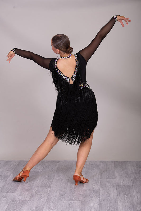 133L BUDGET (23) Black Competition Latin Dance Dress. Beading detail to upper chest. Bead droppers with fringed skirt Stoned in jet ❤️Showroom Appointments Available❤️