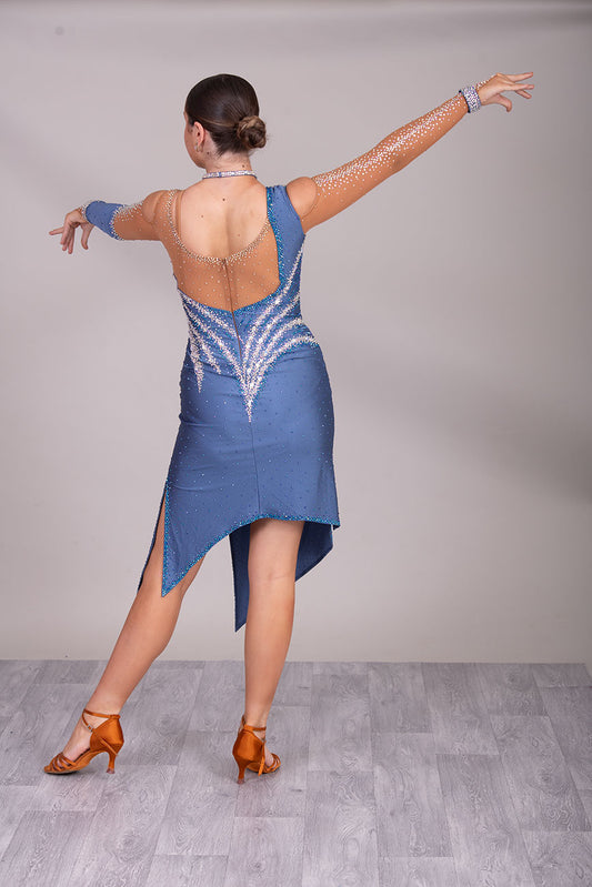 125L Heather Latin Competition Dance Dress. High Back allowing option to wear own Bra. Heather Colour Dress with Cold shoulder sleeves with heavy stoning details. Side splits for maximum leg movement. Showroom Appointment Available