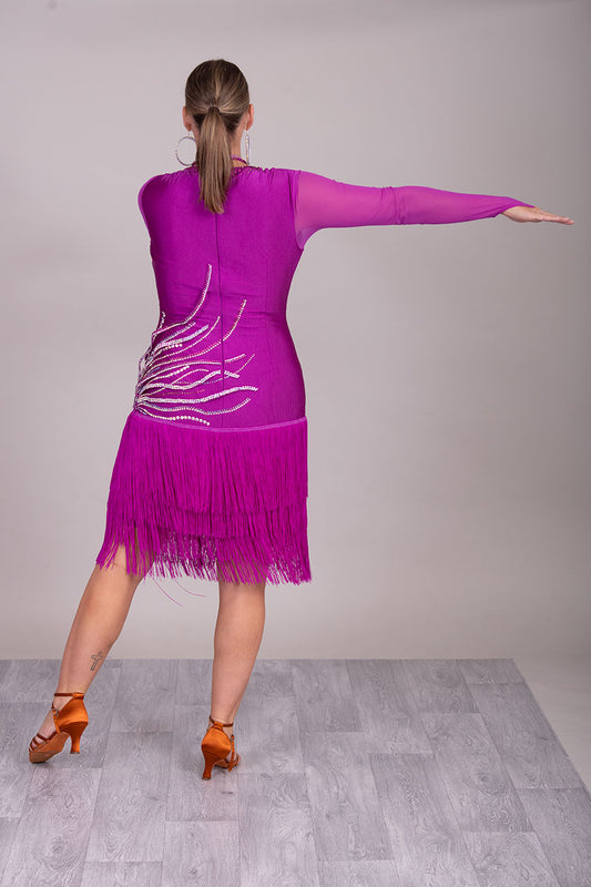 123L Hot Magenta Competition Latin Dance Dress. Flattering Hip Design with full back for option of wearing own Bra & full fringed skirts.