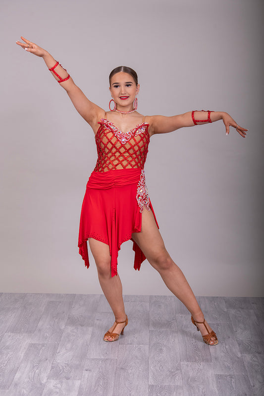 13L Red Fishnet & Flesh Competition Latin/Rhythm Dress. Heavily stoned in Light Siam & AB with decorative side panel.