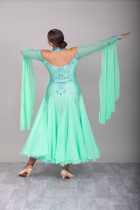 14B Pretty Green Ballroom/Sequence Competition Dance Dress. Elegant Neckline with cold shoulder sleeves. Beautiful stoning design in pale green, green & AB. Detachable Floats