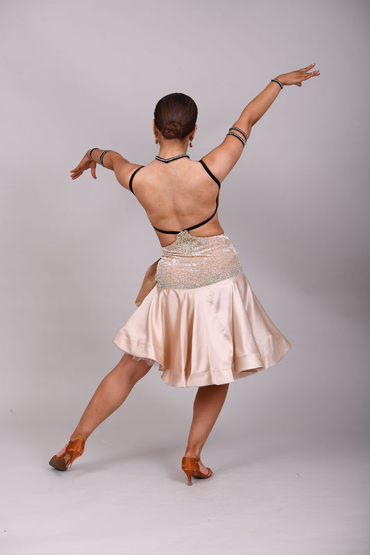 175 Champagne flesh Leopard fabric Latin dress. Soft satin skirt with motif detailing to one hip. Gold appliqué with AB stones