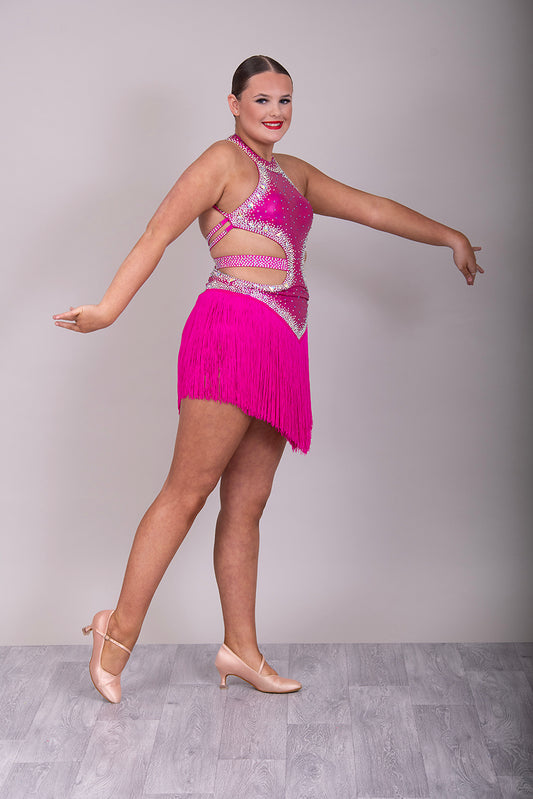 159 Elegant Fuschia Latin Dance Dress. Decorated with Fuchsia mirrors, stones & bead droppers. High back to give option for wearing own bra.