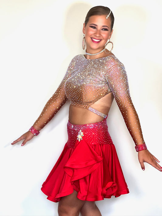 158 Red and Mid Tan Latin 2 piece. Full Skirt for stunning movement with lovely back detailing. Heavily stoned in AB and Red AB