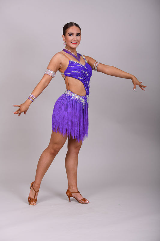 173 Cadbury Purple Latin dance dress. Rouched detailing to the upper body, full fringed skirt. Stoned in AB