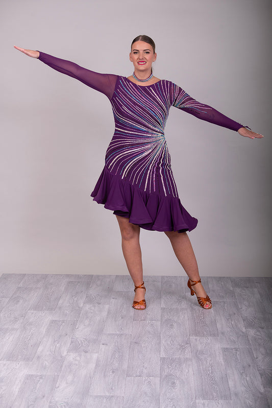 171 Stand Out Striking Plum Latin Dance Dress. Heavily stoned in AB, plum AB & Light aquamarine. Very full frill giving maximum movement. High back giving option to wear own bra.