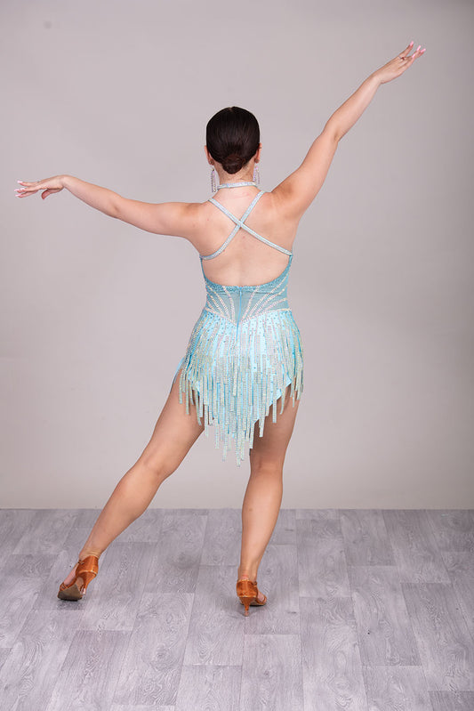 30L Standout Pale Aqua Competition Latin Dance dress. Beautiful front detailing with Aqua mesh centre with corset effect stoning. Heavy stoned fabric tassels to the skirt. Crossover strapping on the back.