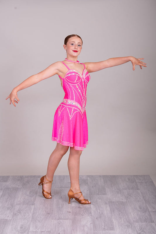 34L Neon Pink Corset style Competition Latin dance dress. Bra cup style bodice with corset effect stoning in AB. Dude splits edged in AB