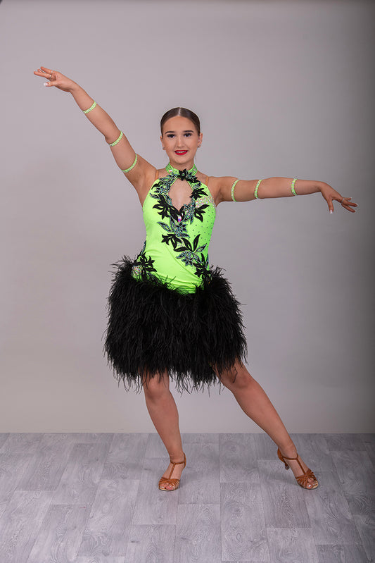 343 Flo Green & Black Latin Dress with keyhole halter neck detail. Strapping design to the back. Full ostrich feather skirt. Decorated with black motifs & stoned in Het AB & AB Boa is hand stitched so could be rearranged