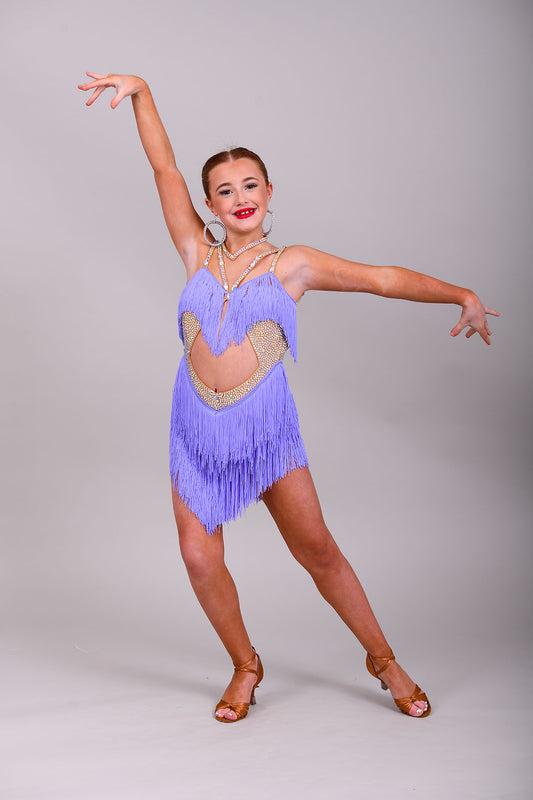 336 Tiny Lilac Latin Dance Dress. Open backed with heavy fringing to the chest and skirt.