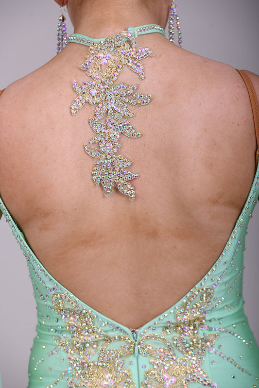 327 mint Green & Gold Ballroom Dress. Decorated with Gold motifs & AB Stones. Comes with separate floaty sleeve cuffs.