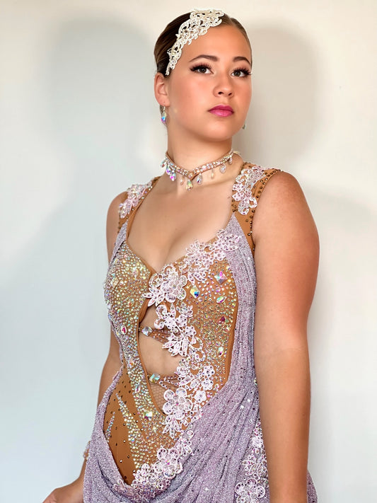 346 Silver Heavily decorated Latin Dress. Decorated with lilac flowers with full back. Front fastening. Decorated with silver motifs & AB stones