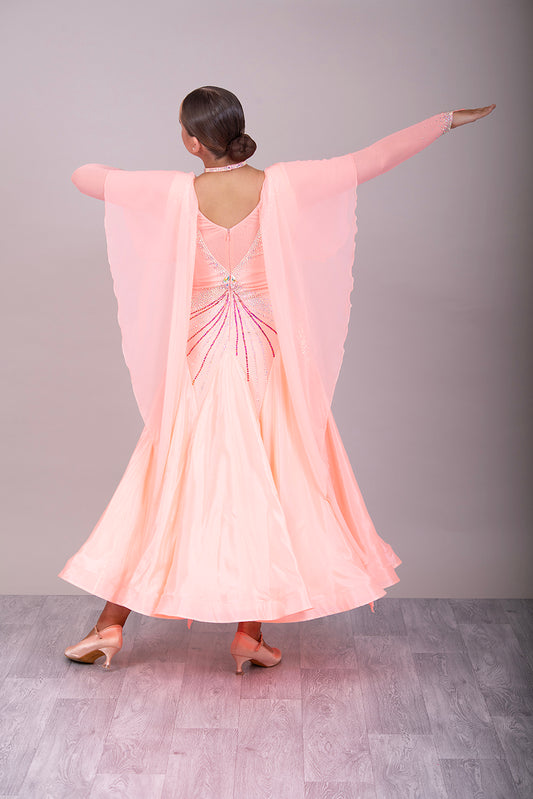 15B Peach Ballroom/Sequence Competition Dance Dress. Beautifully decorated in Peach, Peach AB & AB. Cape effect to the front flowing into floats attached at the shoulders.