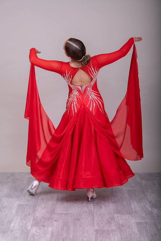 03B Red Ballroom/Sequence Competition Dance Dress. Heavily stoned in AB with Light Siam. Comes with detachable floats.