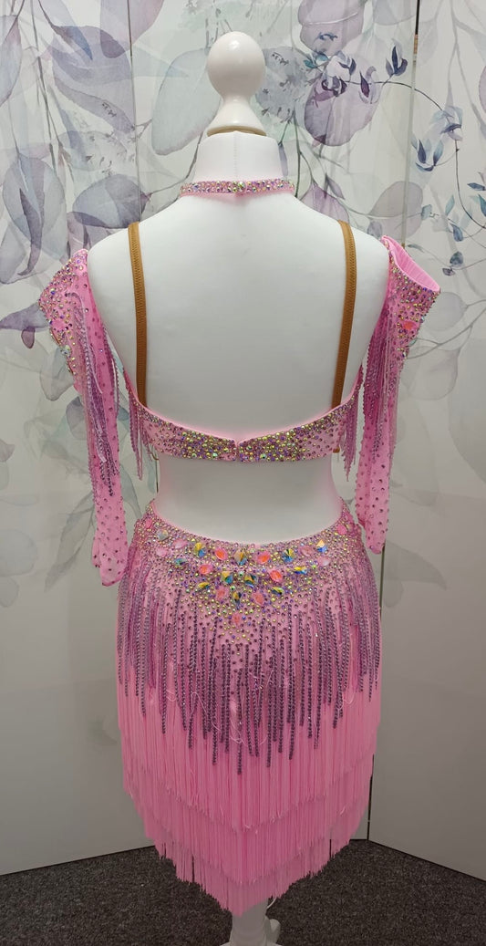 49L Bubblegum Pink Latin Competition 2 piece Dress. Stoned in light rose & bright pink. Stoned fabric droppers throughout. Separate gloves included stoned to match the dress. Length can be shortened to suit. ❤️Showroom Appointments Available❤️