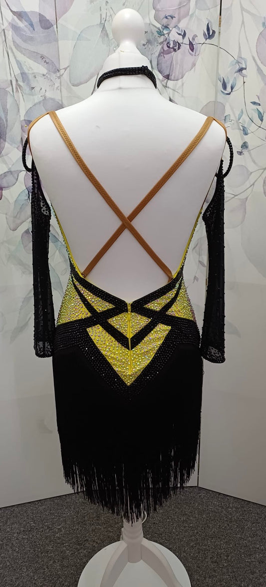 51L Black & Sunshine Competition Latin Dance Dress. Heavily stoned in AB with full fringed skirts. Cones with separate gloves, earring & accessories. ❤️Showroom Appointments Available❤️