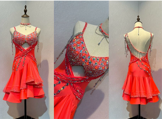 61L Striking Bright Cerise Competition Latin Dance Dress. Stoned in Rose & AB with bead droppers to the keyhole back & upper chest. High back to wear own Bra.