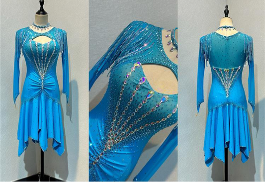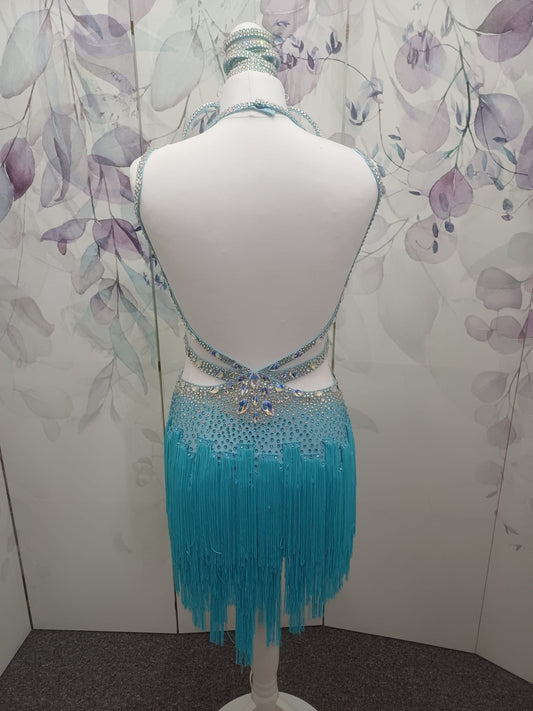 48L Light Turquoise Competition Latin Dance Dress. Stoned in AB & Aquamarine with stoned tassels & upper chest keyhole detail to the front. Rouching detail to the upper hip. Very full skirt for maximum movement. ❤️Showroom Appointment Available❤️