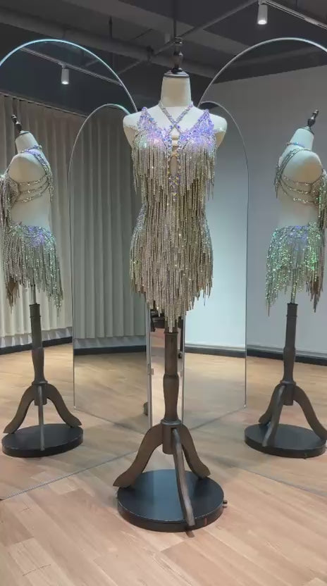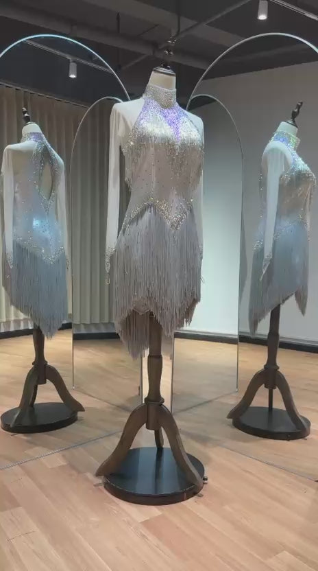 65L Metallic Silver Competition Latin Dance Dress. Silver bead droppers to upper chest, multi layered silver Fringe. Stoned in AB ❤️Showroom Appointments Available❤️