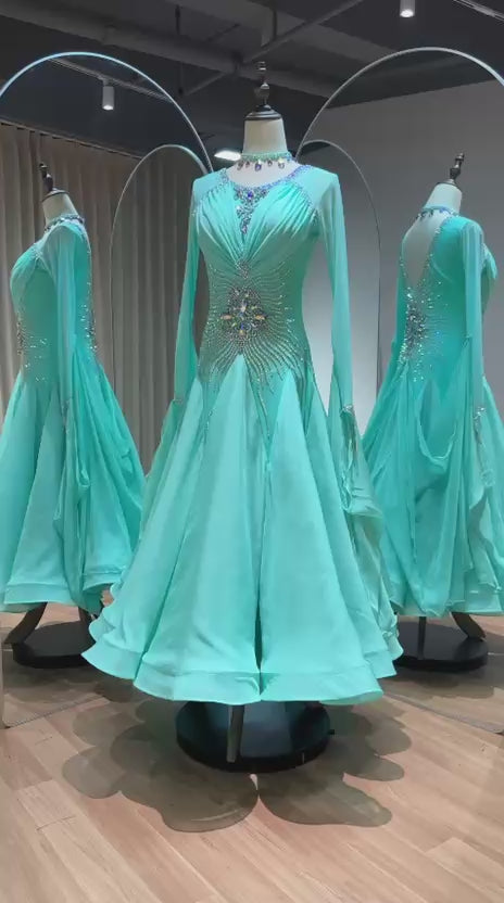 73B Pretty Mint Green Competition Ballroom Dance Dress. Stoned in AB with mesh overlay to the upper chest. Detachable Floats. ❤️Showroom Appointments Available❤️