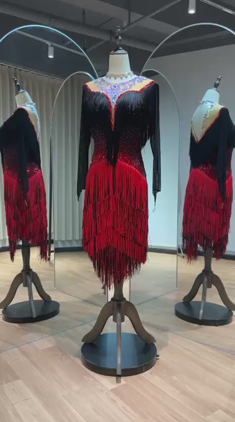 64L TWD ELITE Stand Out Competition Latin Dance Dress. Multiple layers of black & red fringe giving maximum movement. Fringe to upper chest motif stoned in AB, Jet & Siam. ❤️Showroom Appointments Available❤️
