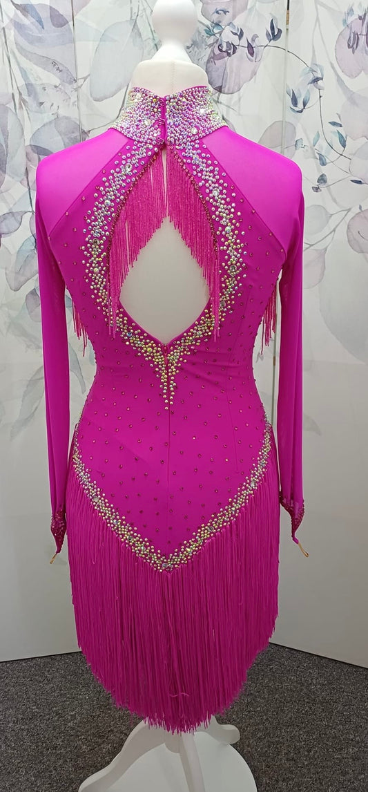 61L Striking Bright Cerise Competition Latin Dance Dress. Stoned in Rose & AB with bead droppers to the keyhole back & upper chest. High back to wear own Bra.