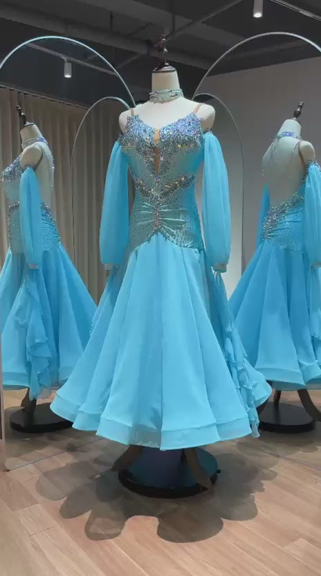 72B TWD Petite Beautiful Blue Competition Ballroom/Sequence Dance Dress. Heavy appliqué stoning to upper chest in Light Sapphire & AB. Separate puff arms with detachable wrist floats. ❤️Showroom Appointments Available❤️