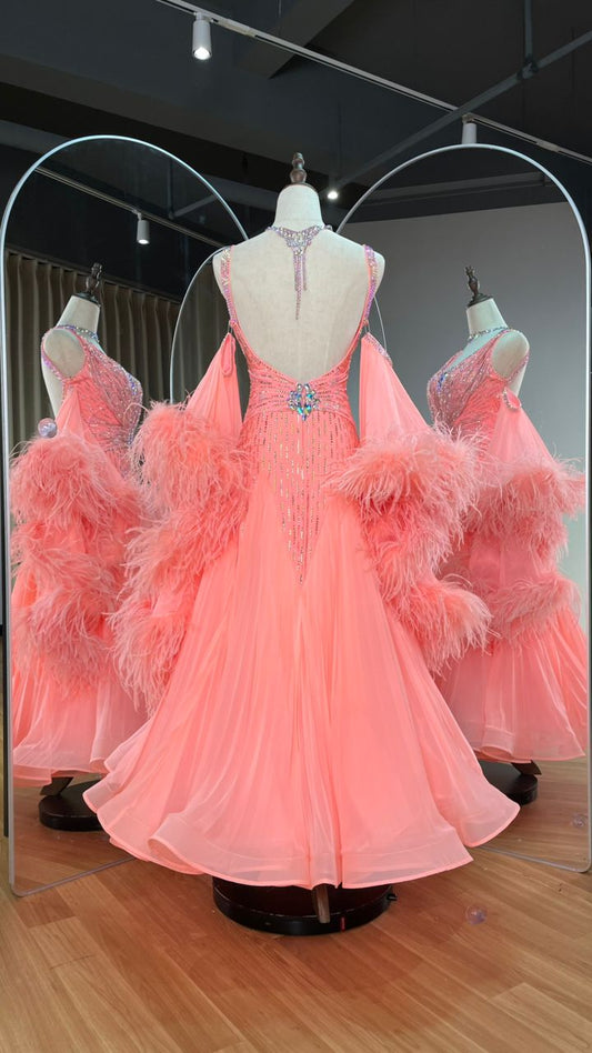 56L TWD ELITE Competition Latin Dance Dress in a beautiful Coral colour. Heavily stoned in AB, Hyacinth & Hyacinth AB. ❤️Showroom Appointments Available❤️