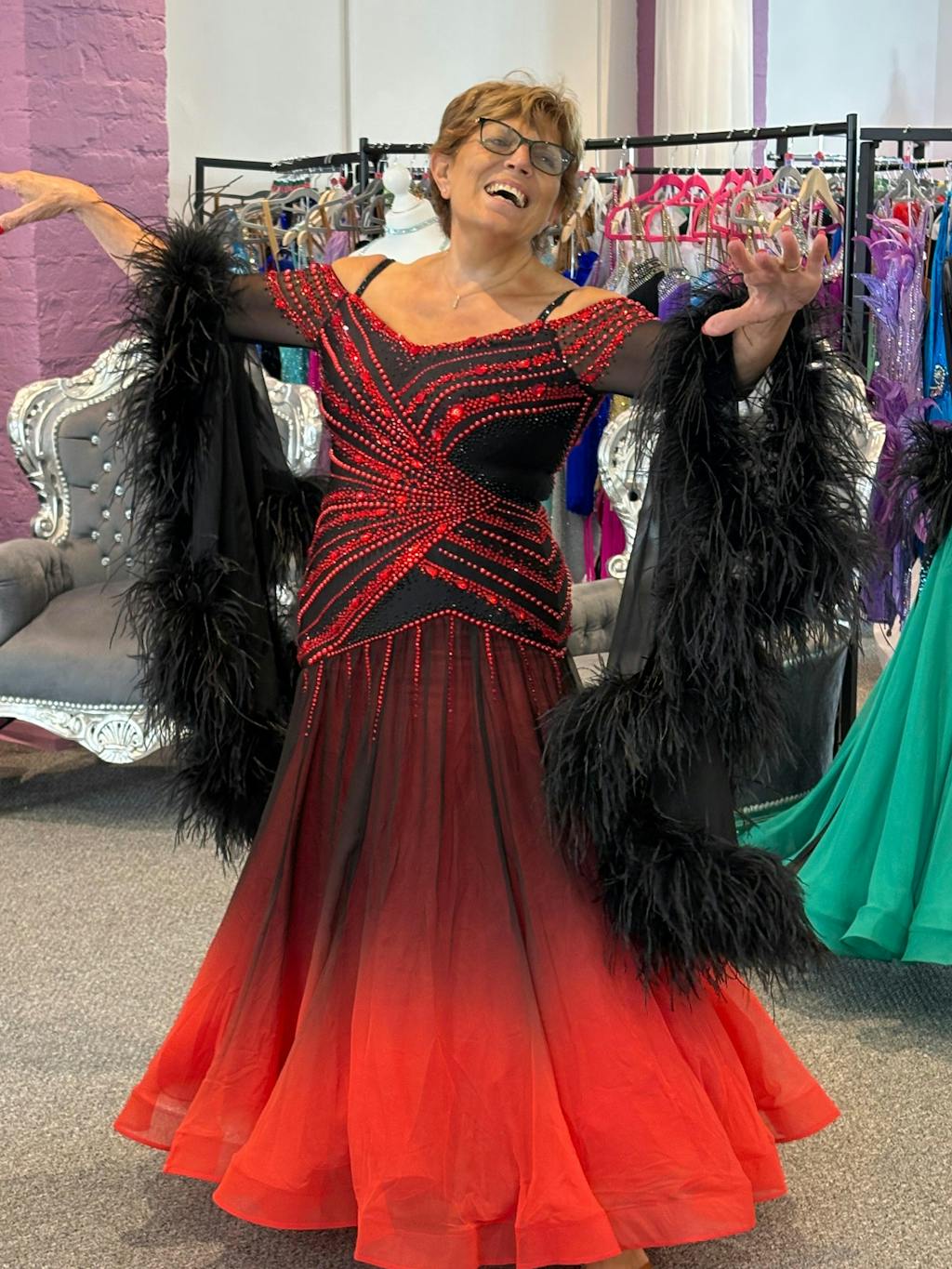 I saw a beautiful dress posted by Tracey on a Facebook group page where I was searching for a ballgown. The dress was stunning and I started a messenger chat with Tracey who was very gracious but while chatting with her that dress was sold. Tracey offered to custom make a similar dress to my specifications so I took her up on it. I received the dress that was shipped to me in the US and as I opened the garment bag it was in I saw my new sparkly red dress, I cried to have received such a beautiful dress made perfectly for me. I twirled in it and embraced the joy I felt at wearing a fantastic ballgown since my last competition over 30 years ago 🥹. Thank you, Tracey for making this dreamy dress for me and being so professional throughout the process.