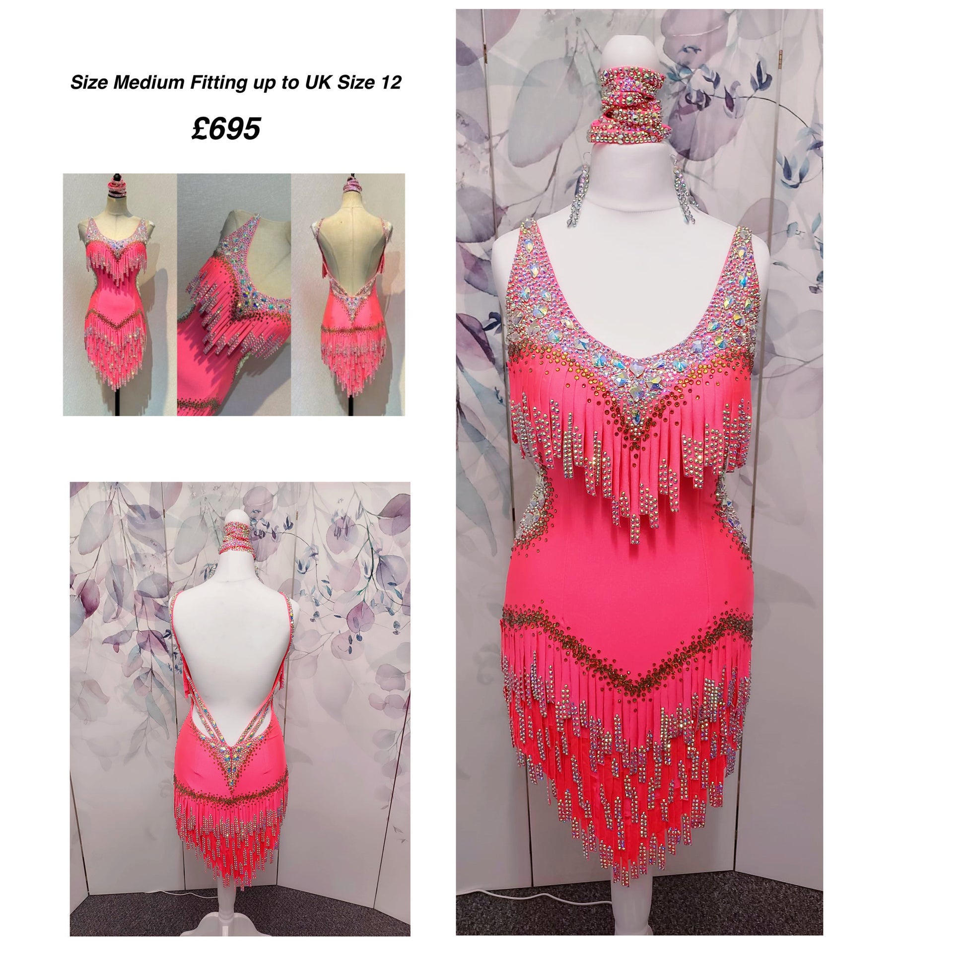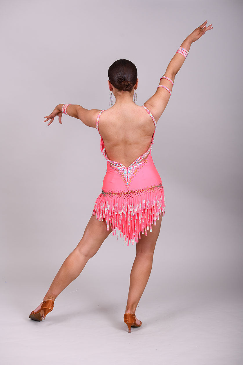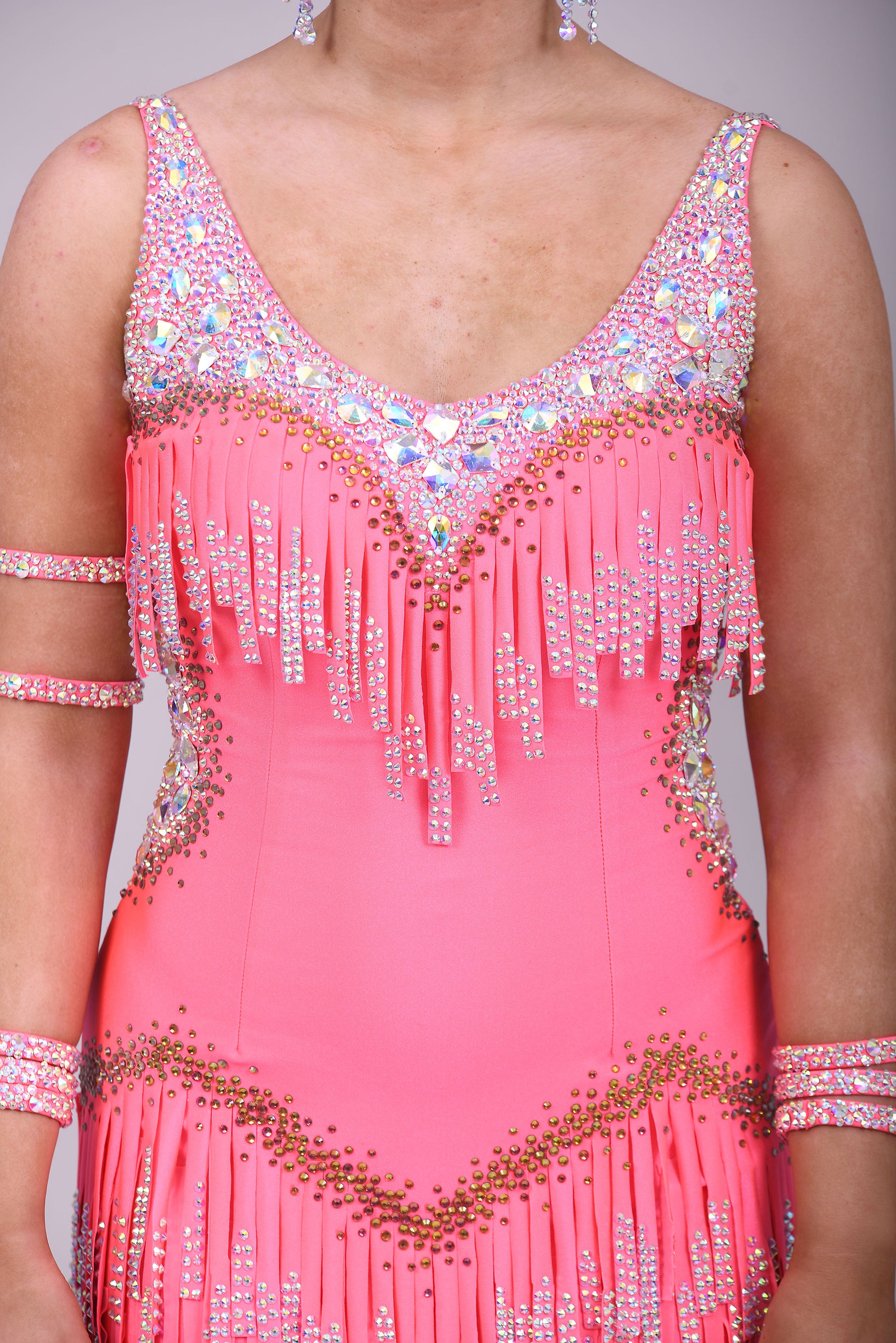 003 Coral Competition Latin Dance Dress. Full stoned fabric fringe details to chest and skirt. Includes bracelets. Stoned in AB & Hyacinth AB