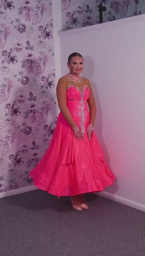 004 Coral Competition Ballroom Dance Dress. Heavily stoned in AB, pink AB & Golden Shadow. Strapping detail to the back. Comes with detachable floats.