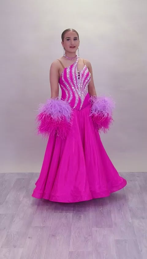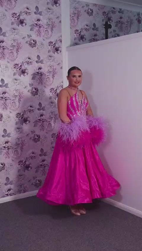 005 Cerise Pink Competition Ballroom Dance Dress. Heavily stoned in AB and Fuchsia & lilac. Comes with ostrich cuffs in Lilac & Cerise. Beautiful back detail.