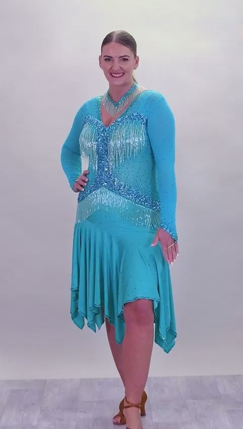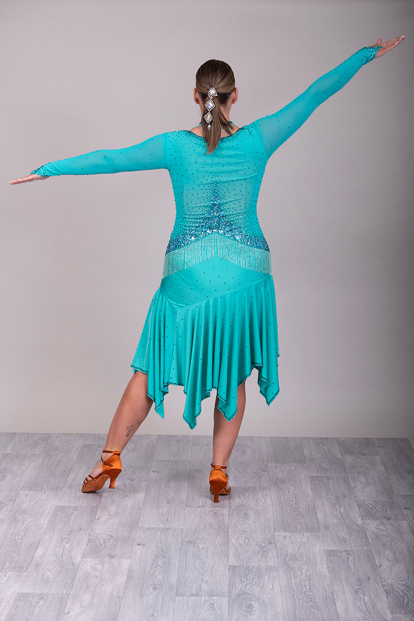 0101 Latin Dance Dress. Very full skirts giving maximum movement. Beading to the chest & waist area. Bodice back & front mesh with flesh under to allow the option to wear own Bra. Stunning stoning detail.