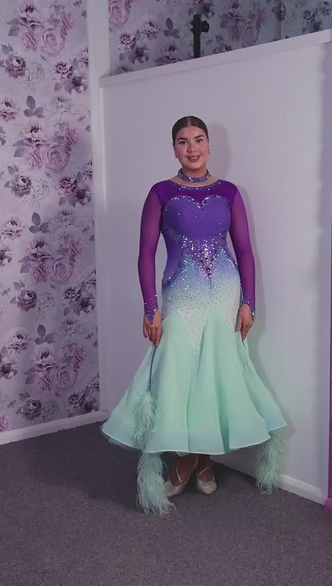 167 Ombré purple to mint green competition Ballroom dance dress. Stoned in mint green, mint green ab, purple & vitrail. Ostrich feather floats attached to stoned strips. High back to give the option of wearing own bra.