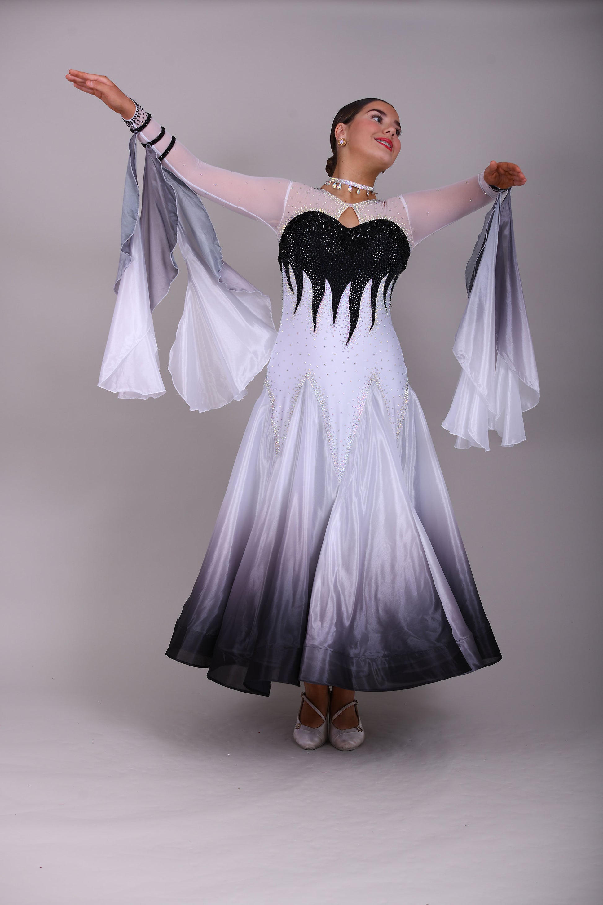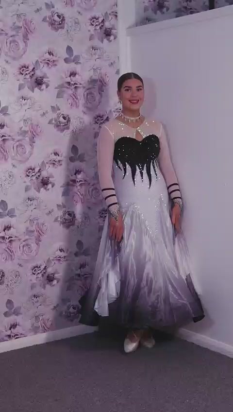 01140 Black & White Ombre Competition Ballroom Dance Dress Upper chest heavily stoned Jet. Pearl Chiffon Ombre skirts. The upper chest is white mesh with skin fabric underneath, giving the illusion of skin. Detachable Floats.