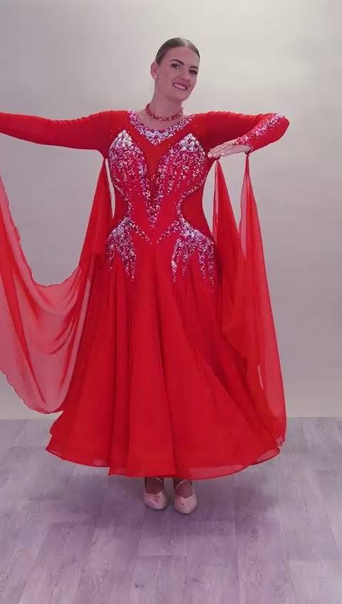 01150A Red Competition Ballroom Dance Dress. Stoned in Siam, Siam AB & AB. Detachable Floats