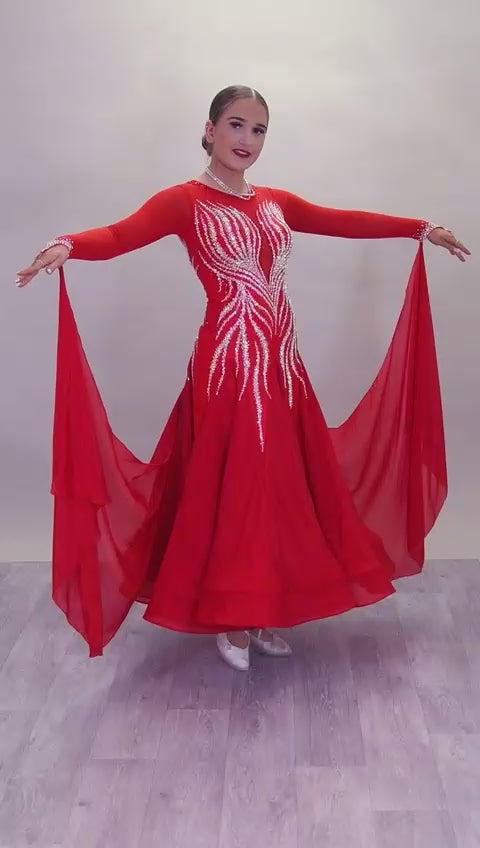 03B Red Ballroom/Sequence Competition Dance Dress. Heavily stoned in AB with Light Siam. Comes with detachable floats.