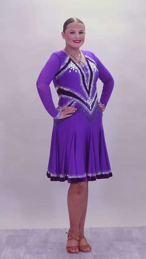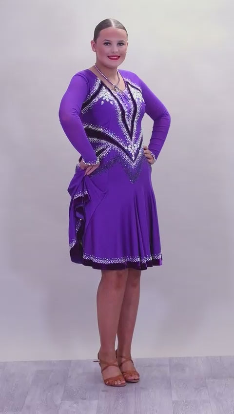 041 Cadbury Purple Competition Latin Dance Dress. Deep purple contrast pattern heavily stoned in AB & Amethyst AB. Bold & Flattering design. Full skirt giving maximum movement.
