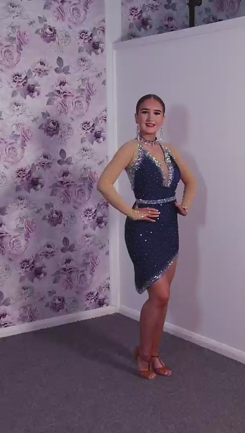 047 Navy blue Drape detail to the front Latin Dress. Separate belt. High mesh back. Decorated with Bermuda blue, light Saphire & Ab stones