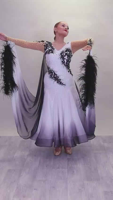 048 White Ballroom Dress with Black lace detailing to the upper chest & sides. Comes with x2 cuffs decorated with appliqué. Stoned in AB and Jet