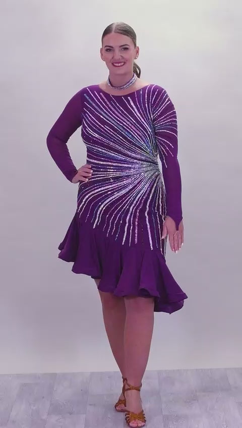 171 Stand Out Striking Plum Latin Dance Dress. Heavily stoned in AB, plum AB & Light aquamarine. Very full frill giving maximum movement. High back giving option to wear own bra.