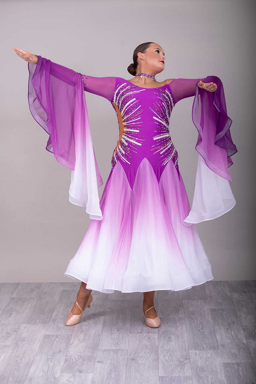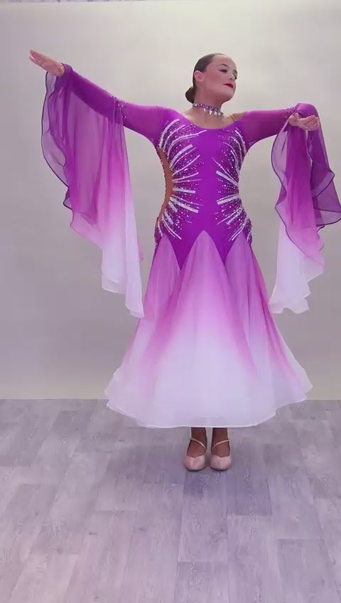 055 Bright Magenta & White Competition Ballroom Dress. Ombré Bell sleeve detail. Stoned in Rose, Rose AB & AB