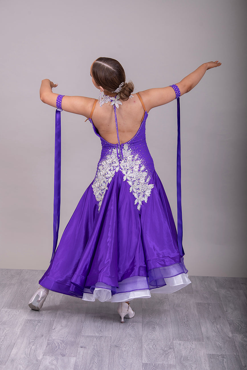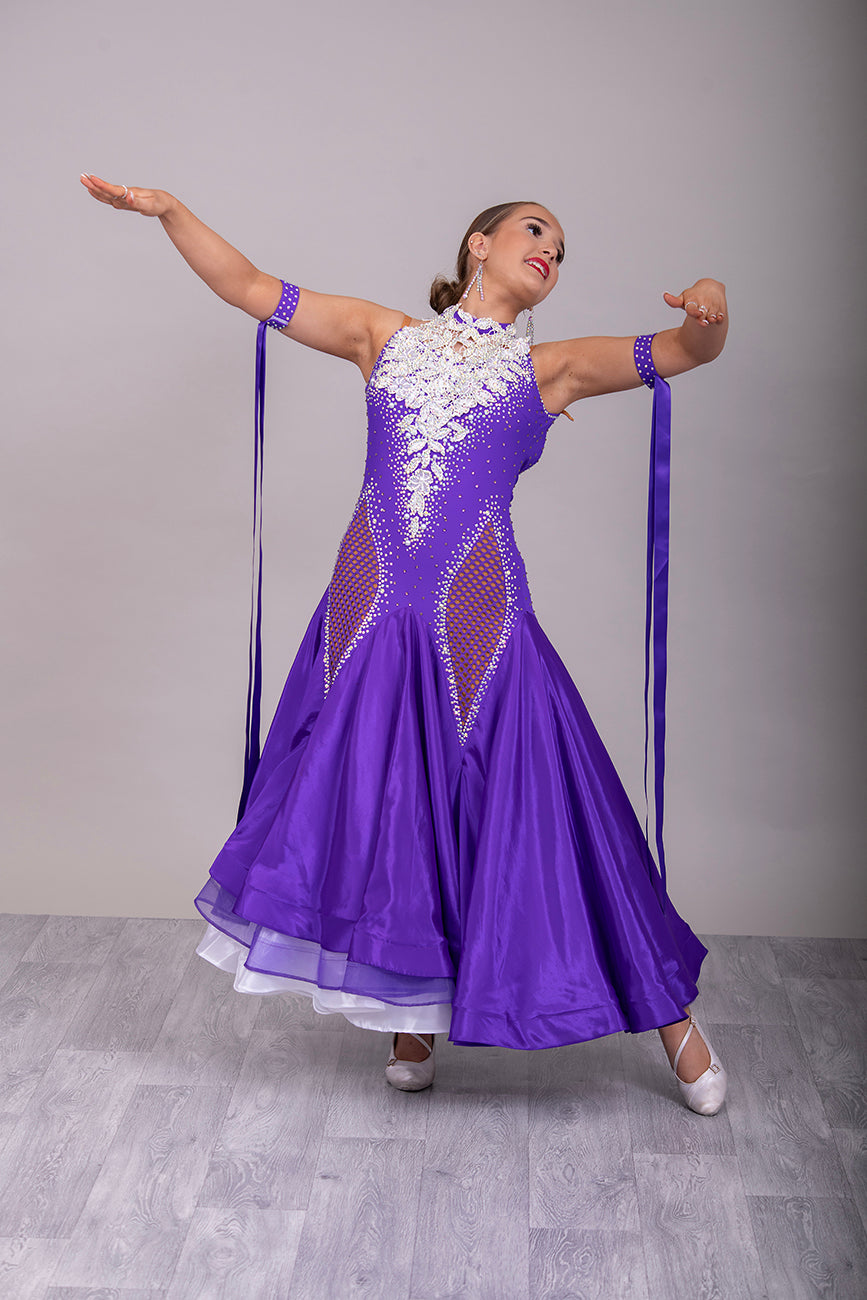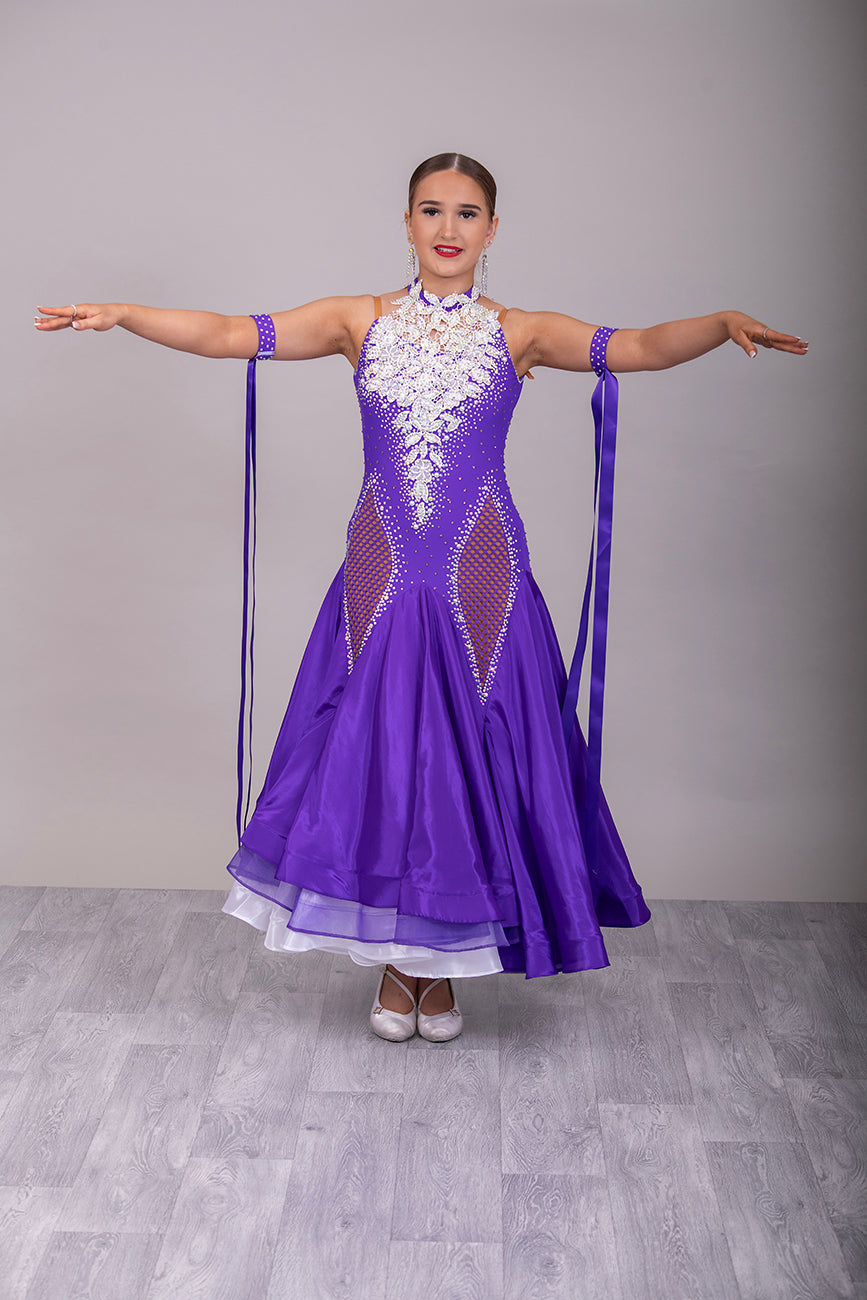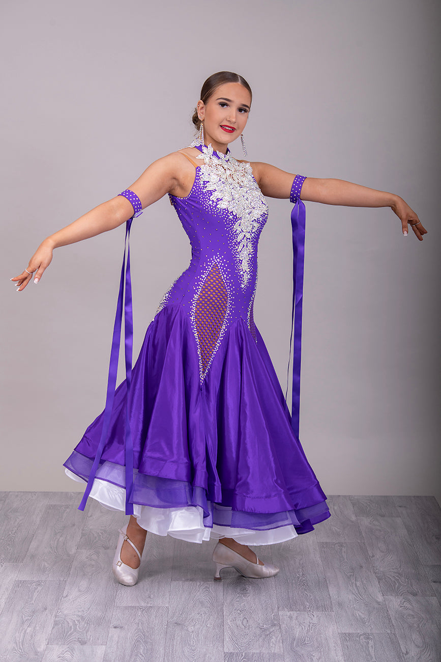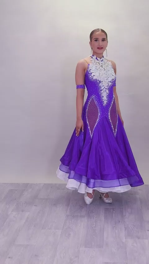 056 Purple Halter Neck Ballroom Dress. White lace detail front/back bodice. Purple fishnet panel on front. Decorated in purple & AB stones. Underskirts in White with exposed satin skirts to one side